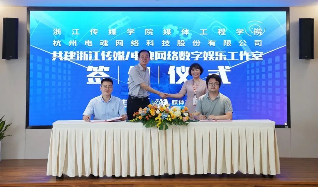 8月17日,浙江传媒学院党委副书记宣裕方、媒体工程学院常务副院长、党委副书记俞定国、副院长周忠成、数字媒体与网络技术系副主任张帆一行前往杭州电魂网络有限公司签署“共建数字娱乐工作室”协议。