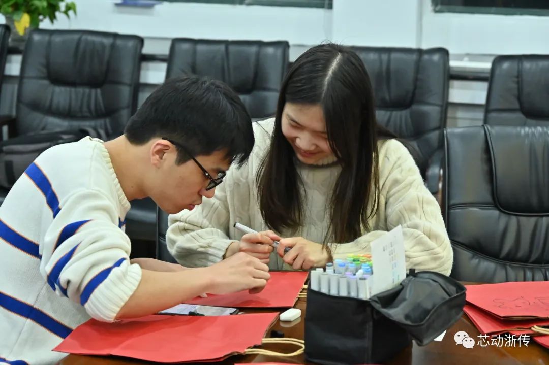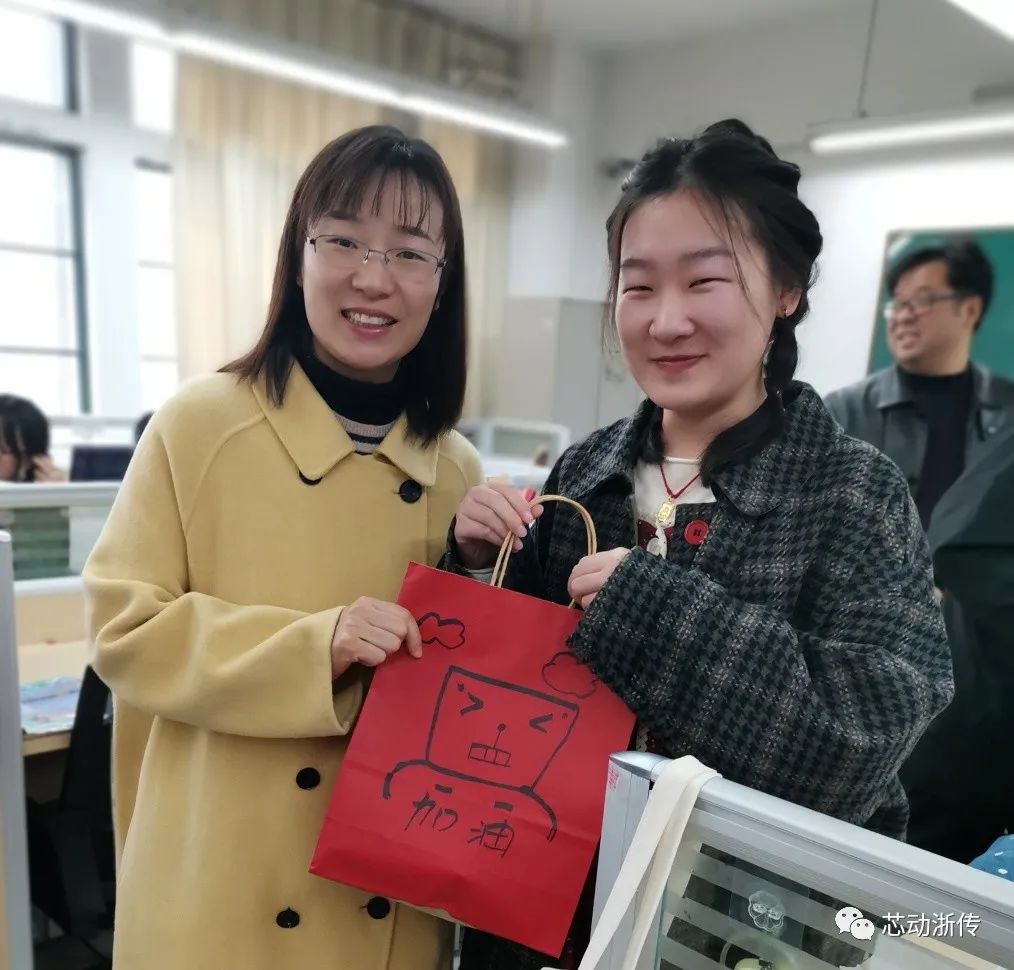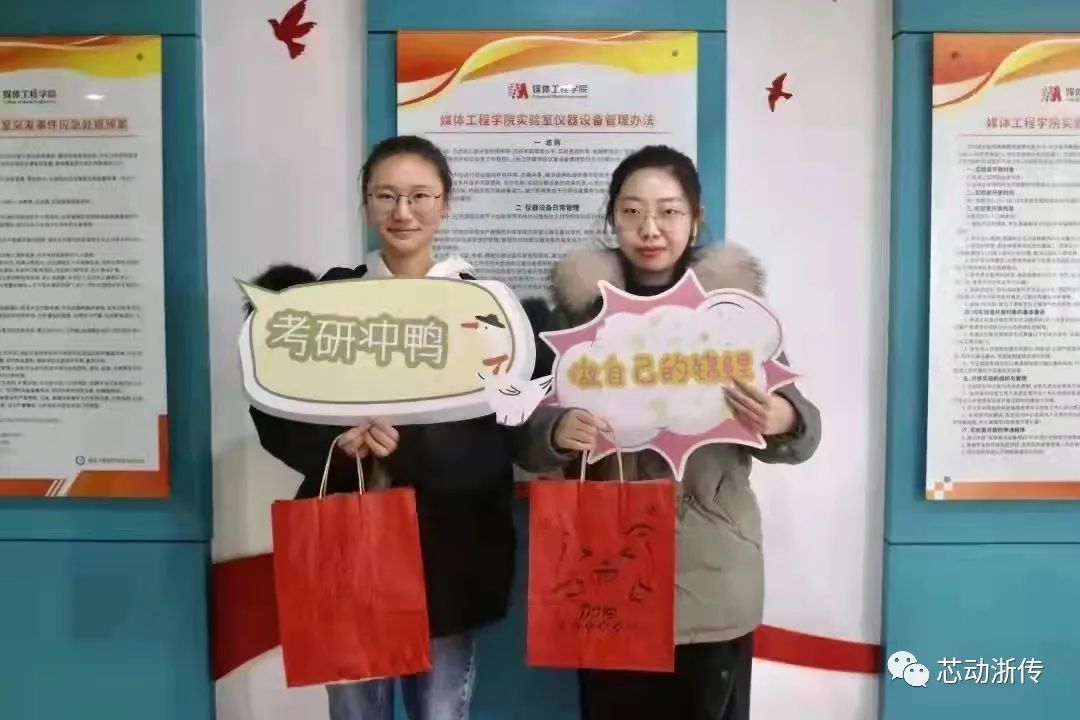 学院学生党员们和学生干部们贴心准备了手绘礼品袋,祝福学长学姐们旗开得胜、金榜题名,学弟学妹用画笔将祝福用卡通形象留在礼包中。每份小礼物都有自己的寓意:橙子、柿子(心想事成)、牛奶(“牛”气冲天),“手绘浙传”特制明信片记录美好祝福,定制专属口罩抵御病毒,带去好运。