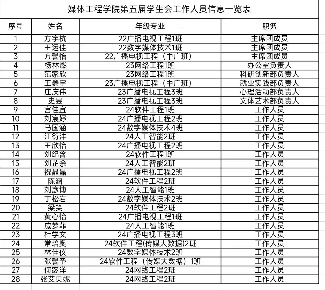 根据《关于推动高校学生会(研究生会)深化改革的若干意见》《关于巩固高校学生会(研究生会)改革成果的若干措施》文件要求,经各团支部推荐、学院分团委审核、学院党委审定,现将媒体工程学院第五届学生会工作人员名单予以公示。
