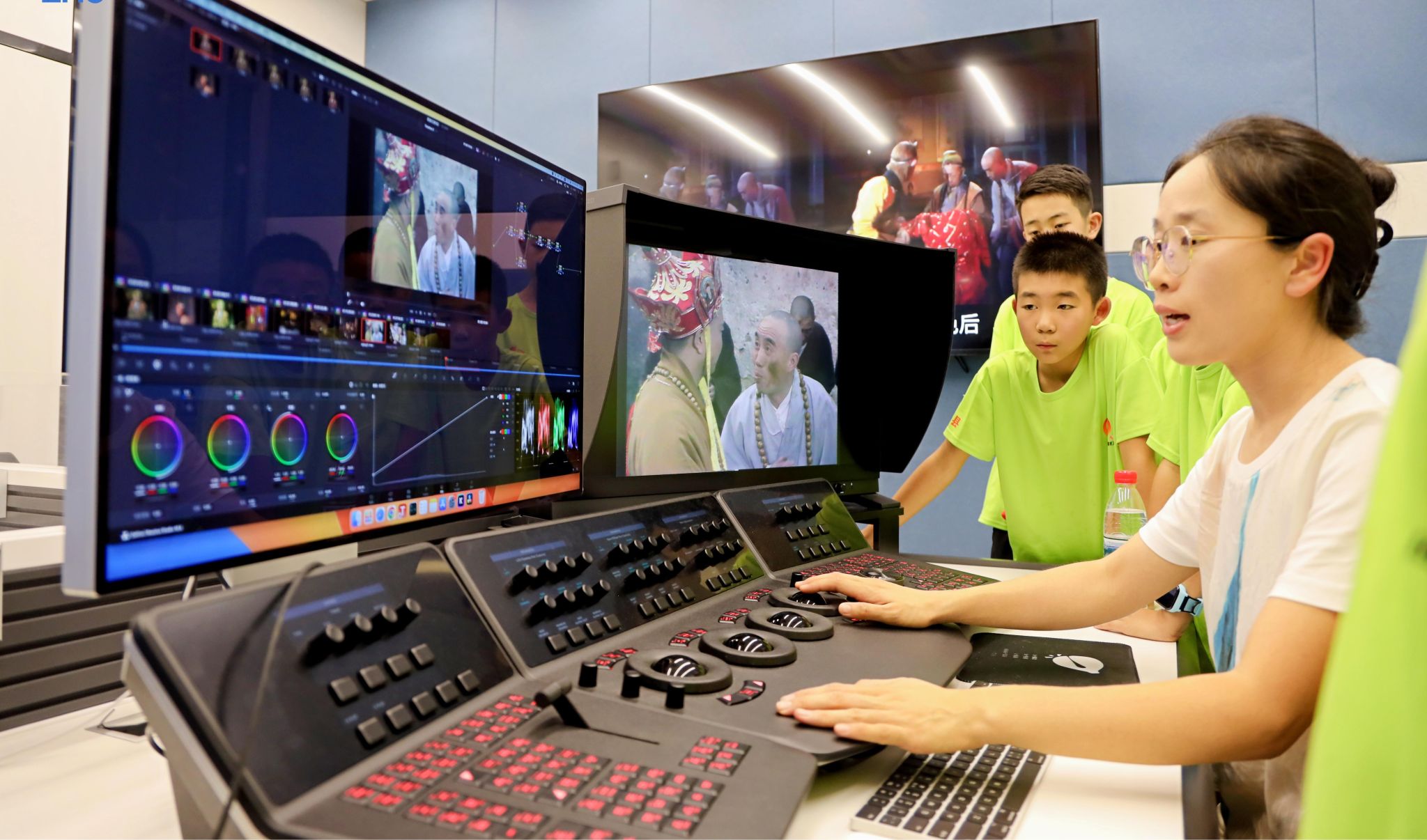 在浙江传媒学院4K电竞综合实验室,茂县青少年们沉浸式体验了国内顶尖视听科技的魅力。在媒体工程学院老师们的引导下,同学们依次参观了导播区、摄像区、虚拟演播区和音控台,详细了解一场高清电竞赛事从现场摄录、信号切换、特效合成到实时推流的全流程制作环节。学生们表示第一次触摸到切换台和调音设备,第一次体验虚拟背景合成技术,感受镜头前后截然不同的视听效果。