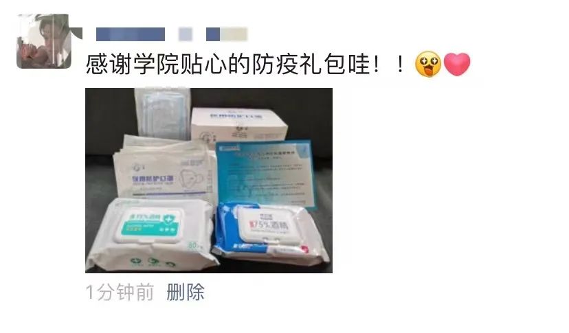 学院的暖心大礼包由N95口罩、消毒湿巾和温馨提示卡组成,不仅提醒同学们在疫情当下要做好防护,也充分展现了学院对学生们的关爱。同时,在学生离校返家前学院还利用线上主题班会的形式,开展疫情防控有关安全知识教育。另外,学院还为生病、考研的学生准备了礼物